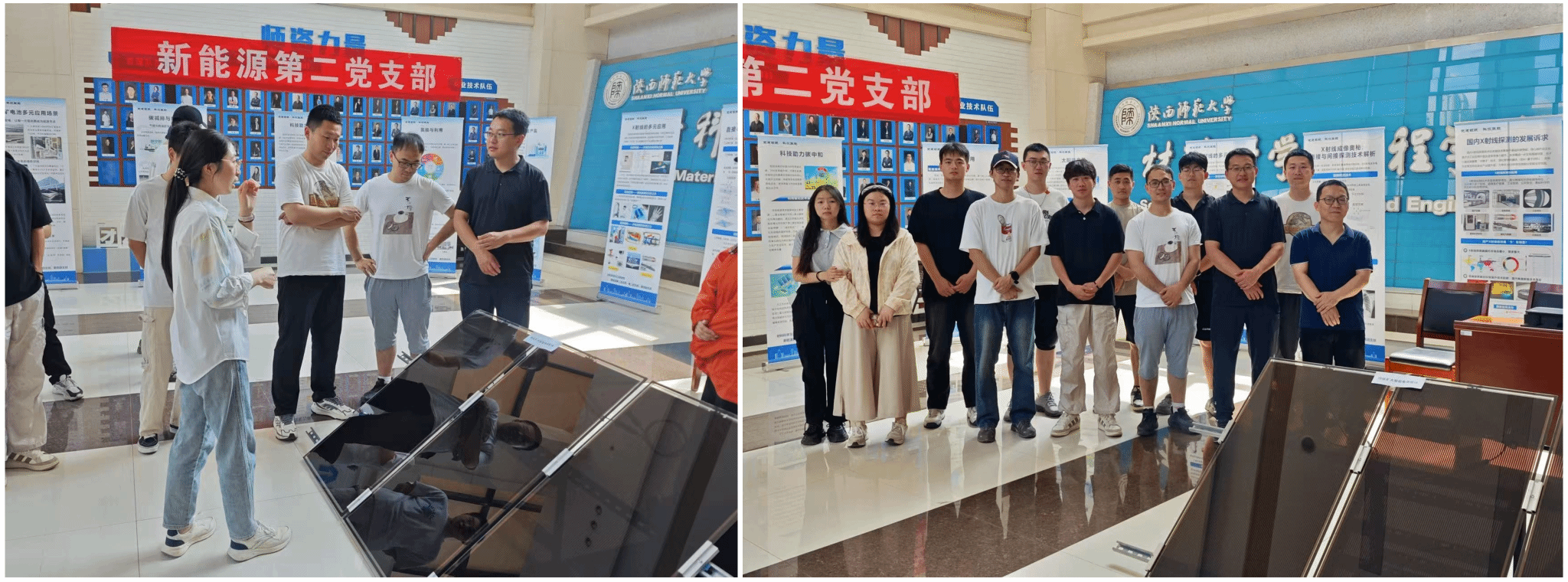 公司新能源第一党支部和60余名师生代表到活动现场参观,由新能源第二党支部副书记贾彬霞博士进行讲解。师生围绕钙钛矿单晶材料与电池组件技术展开深度交流,并就支部建设、活动组织等议题开展研讨,通过'展、讲、研'三位一体模式,实现党建工作与科技实践的双轮驱动。
