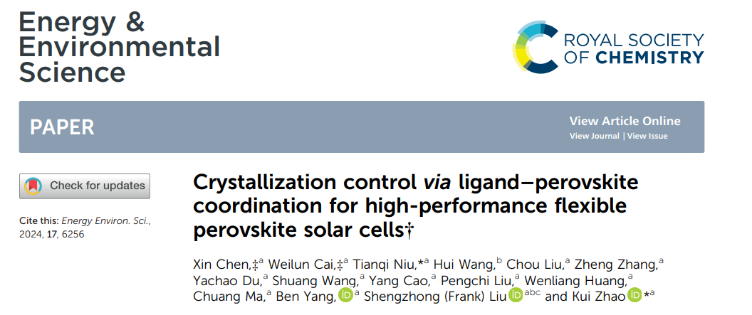 总之,配体辅助配位策略的研究不仅揭示了分子配位对低温加工过程中钙钛矿结晶动力学的影响,而且为实现高性能、可扩展的柔性钙钛矿太阳能电池的生长优化提供了战略指导。相关研究工作以Crystallization control via ligand-perovskite coordination for high-performance flexible perovskite solar cells为题,发表在国际顶级期刊《Energy & Environmental Science》