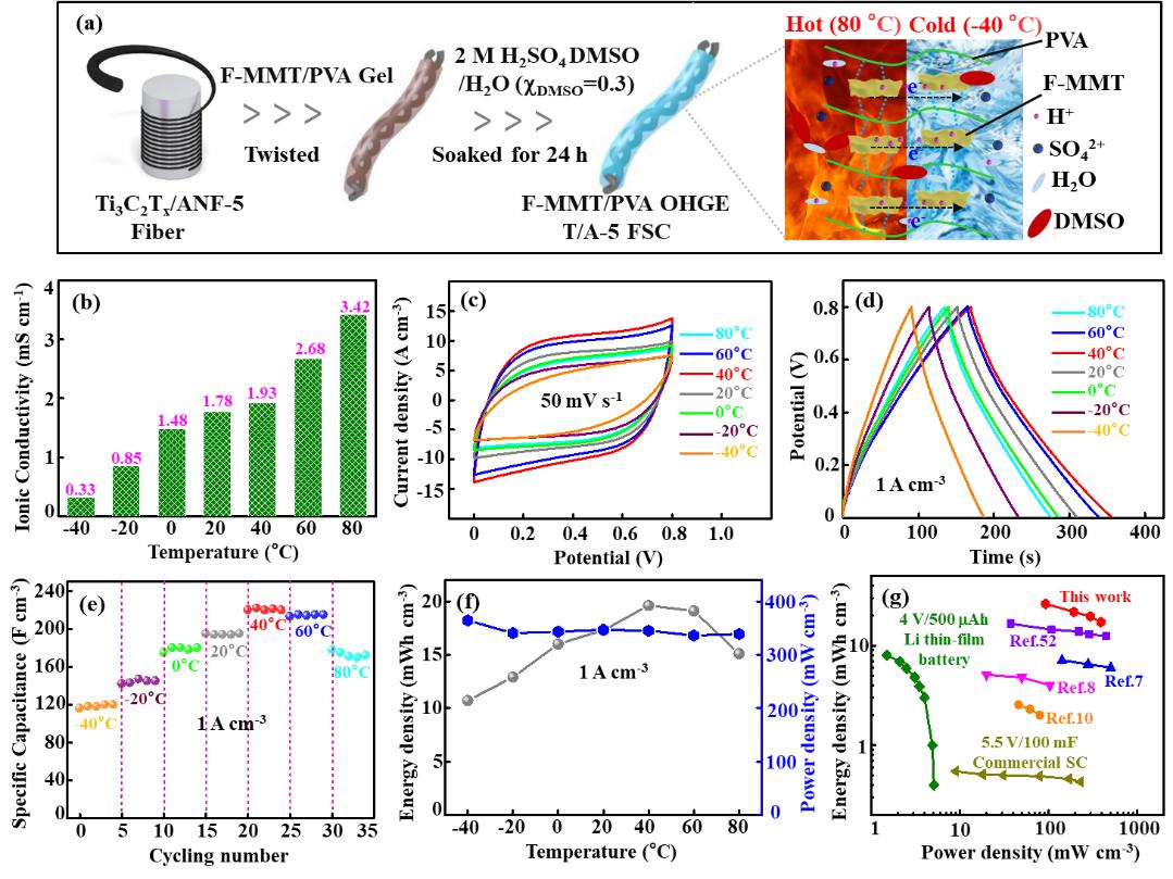 近日,公司刘宗怀教授和何学侠副教授课题组,以一维芳纶纳米纤维(ANF)作为柔性功能添加剂,二维Ti3C2Tx纳米片为组装单元,采用湿法纺丝技术,在0.5 M FeCl2凝固浴中成功制备了兼具柔性与高电容性能Ti3C2Tx/ANF(T/A)复合纤维电极。同时,将剥离后的蒙脱土纳米片(F-MMT)及二甲基亚砜(DMSO)引入到传统的聚乙烯醇-硫酸(PVA-H2SO4)水凝胶电解质中,成功制备了具有低温抗冻、高温耐热、质轻、柔性和高离子导电性F-MMT/PVA有机水凝胶电解质。以Ti3C2Tx/ANF-5纤维作为正负极、F-MMT/PVA有机水凝胶电解质作为电解质和隔膜,分步浸泡成功组装了全温全固态柔性F-MMT/PVA T/A-5基纤维超级电容器。组装的纤维超级电容器具有295 F·cm-3的高比电容和26.2 mWh cm-3的体积能量密度, 10000次充电/放电循环后电容保持率为91%。同时,F-MMT/PVA T/A-5基纤维超级电容器在-40~80 °C的宽温度范围内展现出了良好的柔性和优异的电容性能。该研究为设计和组装具有电容性能和柔性优化平衡的全温度全固态对称柔性纤维超级电容器提供了新策略。