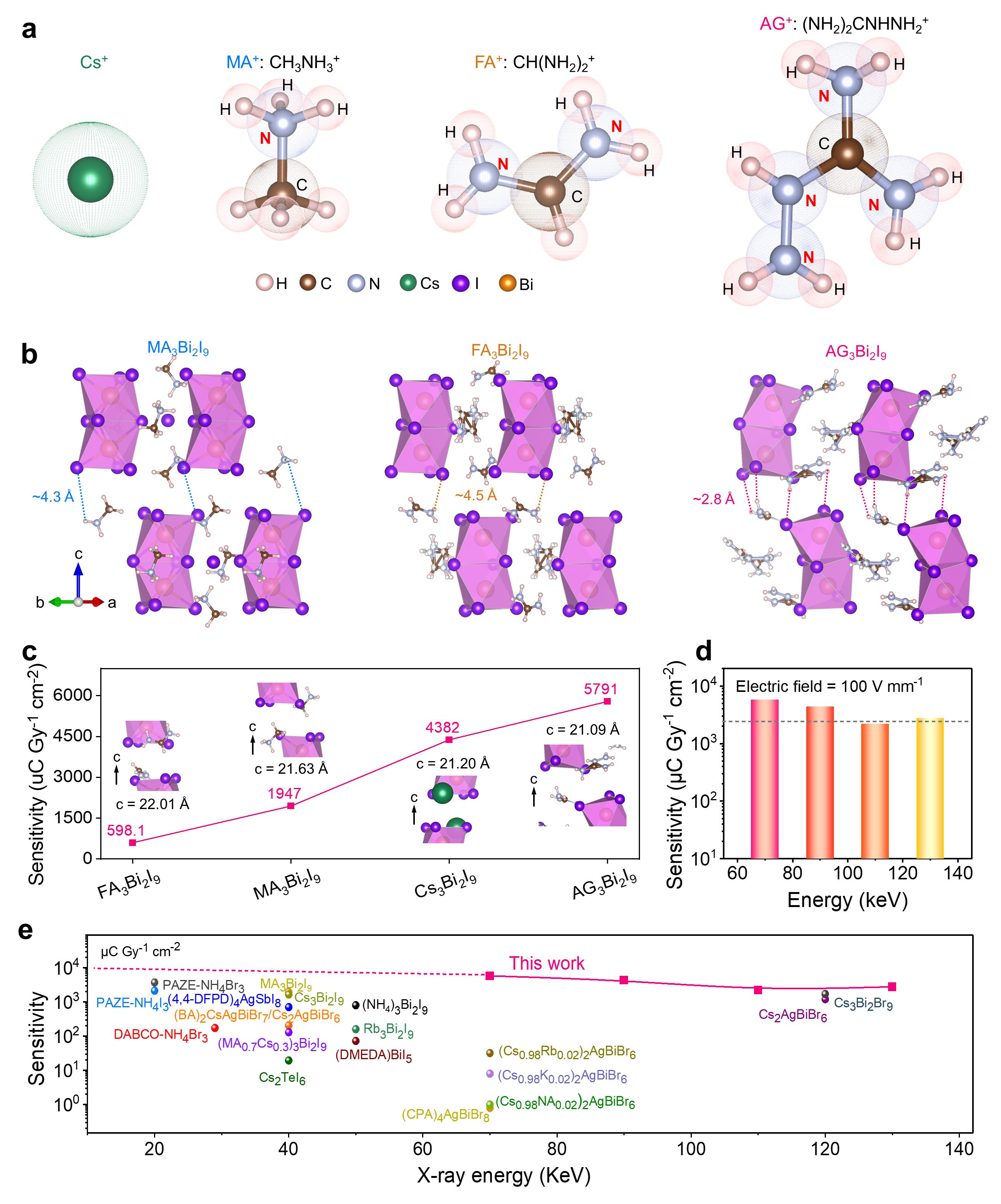 近日,公司钙钛矿材料与器件团队设计了一种具有全-NH2终端的氨基胍(AG) A位阳离子,通过形成更多更强的N−H···I氢键来缩短AG3Bi2I9层间间距,有效提高了单晶纵向载流子迁移能力。研究结果表明,采用低温溶液法生长的大尺寸AG3Bi2I9单晶获得了目前非铅钙钛矿单晶最大的迁移率-寿命乘积(7.94 × 10-3 cm2 V-1),相较本团队先前报道的最佳MA3Bi2I9单晶的迁移率-寿命乘积 (2.87 × 10-3 cm2 V-1)有大幅提升。此外,使用AG3Bi2I9 单晶组装的 X 射线探测器具有5791 uC Gy−1 cm−2的高灵敏度和2.6 nGy s−1的低检测限,其灵敏度高于目前商用X射线探测器的10倍,检测限也远远低于国际医学X射线成像最低剂量标准。AG3Bi2I9 单晶探测器同时具有690 μs的短响应时间和优异的高能射线连续辐照稳定性。此外,高灵敏度、低噪声电流以及高稳定性使得探测器实现了空间分辨率高达8.7 lp mm-1 的X 射线成像。