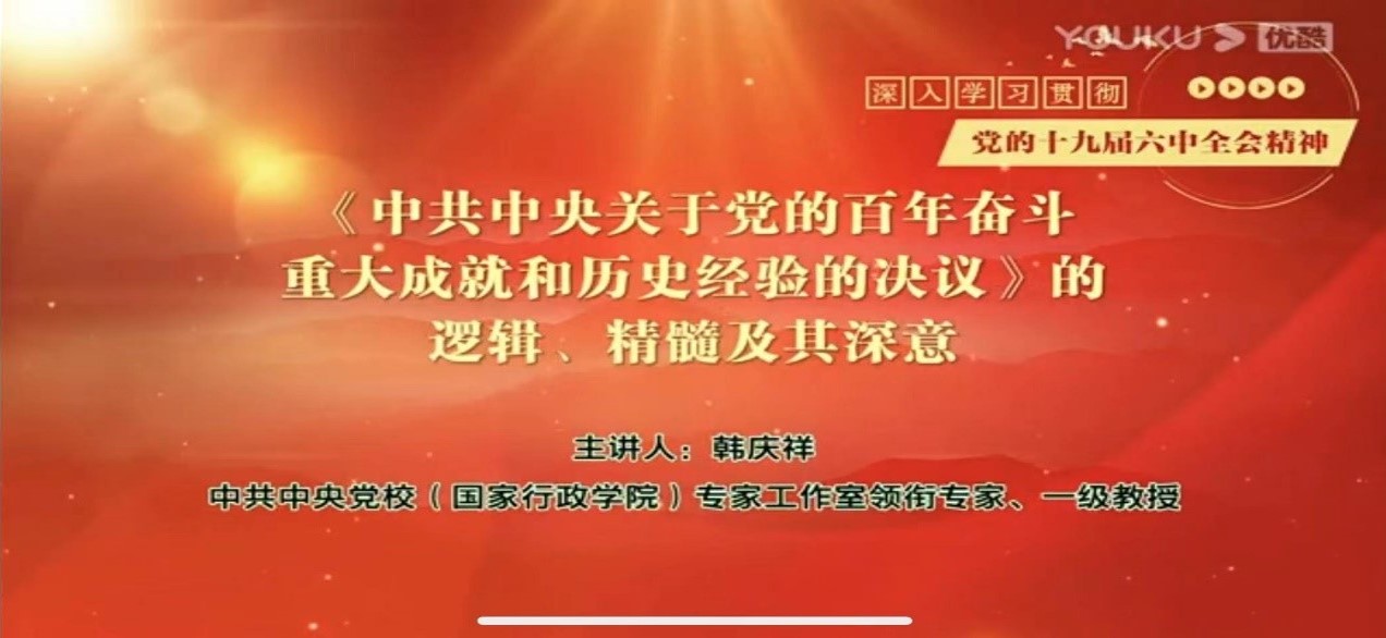 接着,中心组成员通过视频学习了《<中共中央关于党的百年奋斗重大成就和历史经验的决议>的逻辑、精髓及其深意》。深刻理解了“决议”用“根本问题”解释百年奋斗,用百年奋斗支撑重大成就,用重大成就确证历史意义,从历史意义提升历史经验,以成就贡献支撑“两个确立”,用“两个确立”确保强国复兴的深刻内涵。