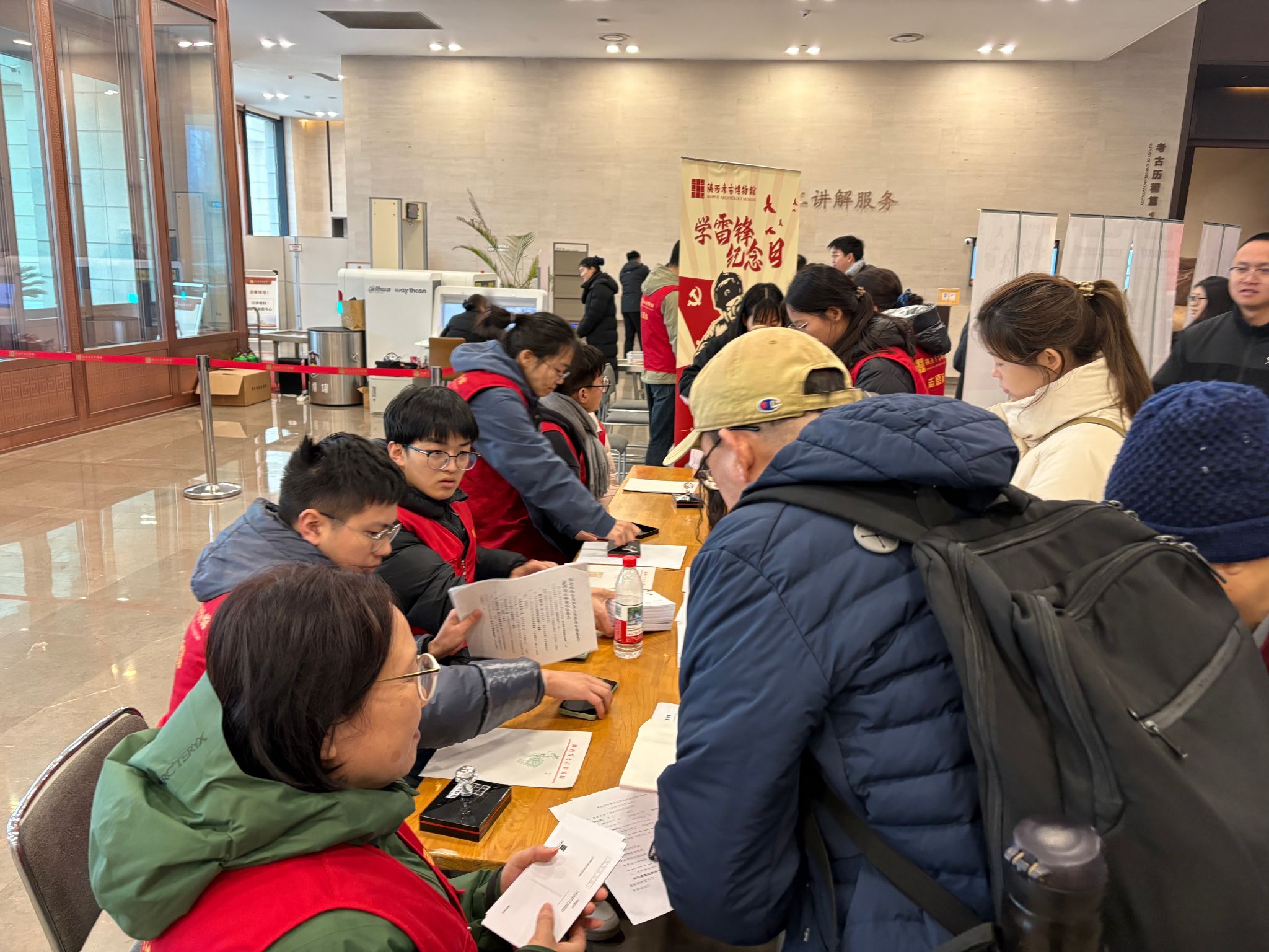 下午13:00,学雷锋志愿服务活动正式开始,志愿者们统一穿着志愿者马甲,佩戴工作证,在博物馆工作人员的带领下分组开展工。咨询引导组的志愿者们为游客发放参观导览手册,提供博物馆布局介绍、参观路线指引等服务;雷锋精神宣传组在广场布置了“雷锋精神”图文展,结合文物修复故事诠释奉献精神;讲解组的成员们在博物馆展厅轮流为游客进行志愿讲解,生动讲述了文物背后的历史与文化。