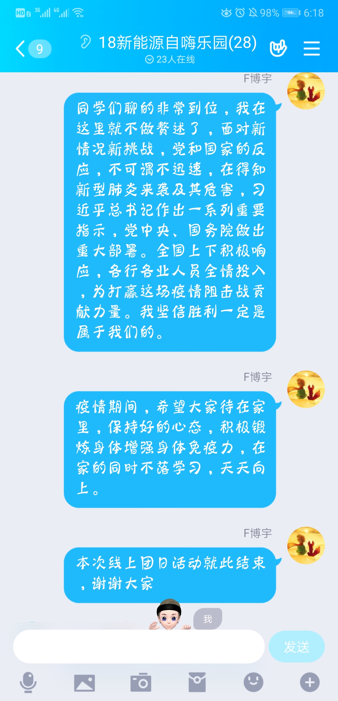 2018级1班和2班团支部的同学们在班级QQ群里谈在这次疫情中的思考和感触,同学们表示,疫情当前,每位同学都是责任人。我们应该向战“疫”先锋钟南山学习“士不可以不弘毅”的深沉担当;向战“疫”先锋李兰娟学习“绝知此事要躬行”的专注实干。作为新时代老员工我们更应该知道战线就在脚下,初心行将致远;学在当下,即刻战“疫”!