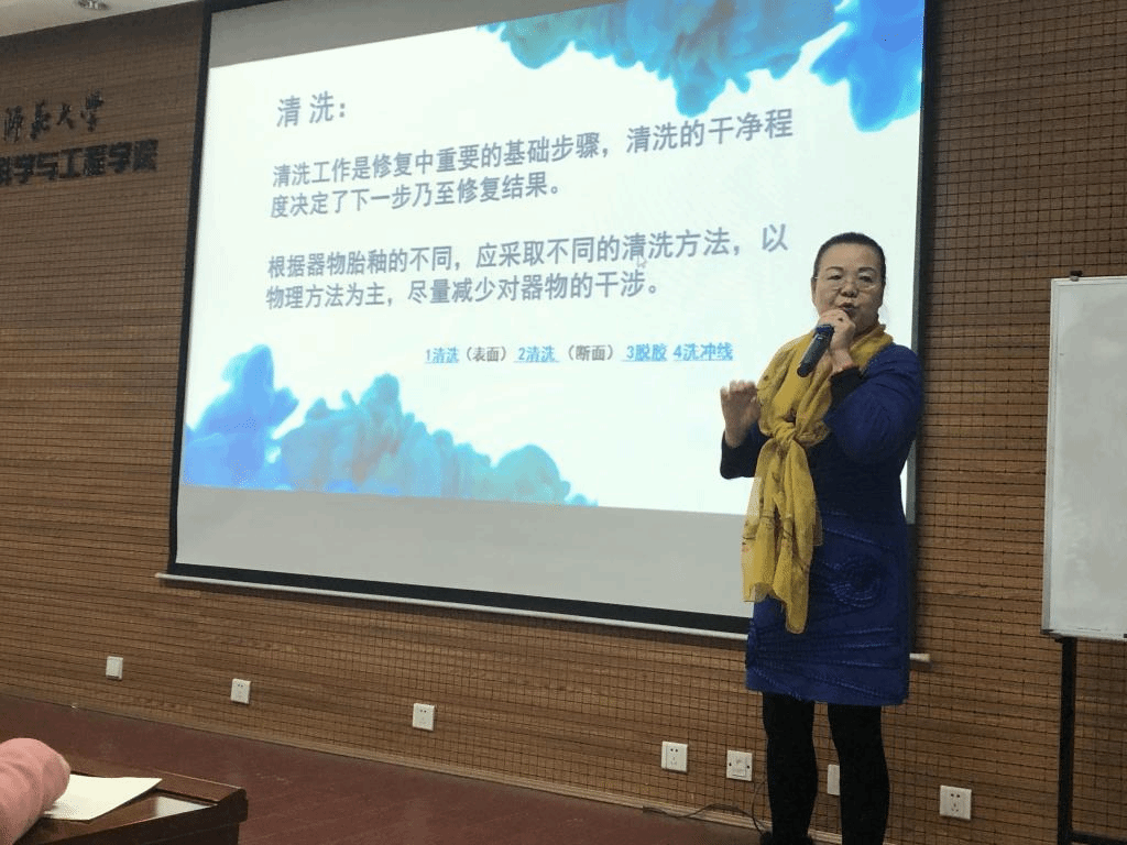 2019年11月5日下午,国内著名陶瓷修复专家于爱平老师应邀访问公司,在致知楼2307报告厅为公司师生做了题为“古陶瓷修复的理念和修复的工艺”的学术报告。参会人员有公司胡道道教授,白崇斌教授,邢惠萍副教授,历史文化遗产保护教育部工程研究中心晁小练副主任、汪娟丽博士、贾智慧博士、刘姣姣博士、曹静博士以及七十余名员工(包括国际职工)、慕名而来的校外老师,此次报告会由胡道道教授主持。