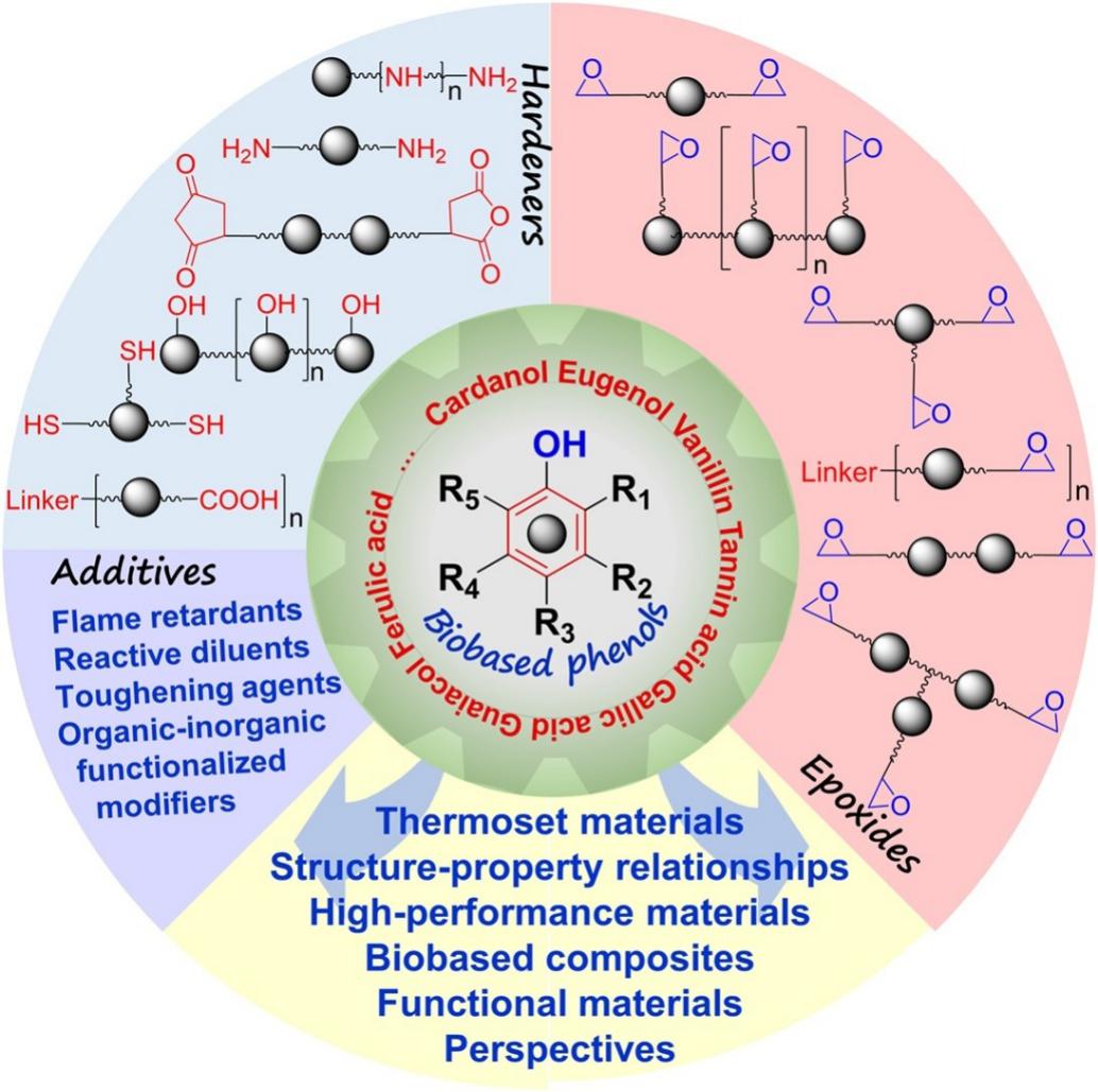 为此,近年来基于可再生生物基单体酚类化合物的环氧树脂引起广泛关注,并在某些具体场合显示出替代双酚A环氧树脂的潜力。近日,公司英国365集团官网历史文化遗产教育部工程研究中心胡道道教授、万金涛副教授团队系统综述了近年来基于生物基单体酚的热固性环氧树脂研究进展,以衍生环氧树脂分子结构和化学转化路线为主线,全面梳理和回顾有关的环氧树脂单体、预聚物、固化剂、添加剂和复合材料的研究,并对所得热固性环氧树脂材料的结构和性能进行了综合评论,最后展望了未来研究中的挑战和机遇。相关成果以“Epoxy thermosets and materials derived from bio-based monomeric phenols: Transformations and performances”为题发表在高分子领域国际顶尖期刊《Progress in Polymer Science》(CiteScore=41.1,Impact Factor=22.62),该论文公司为第一单位,参与单位有华南理工大学、化学工程联合国家重点实验室(浙江大学)、江苏科技大学和西班牙马德里高等材料研究所,第一作者和通讯作者为公司英国365集团官网万金涛副教授,马德里高等材料研究所王德义高级研究员为共同通讯作者。
