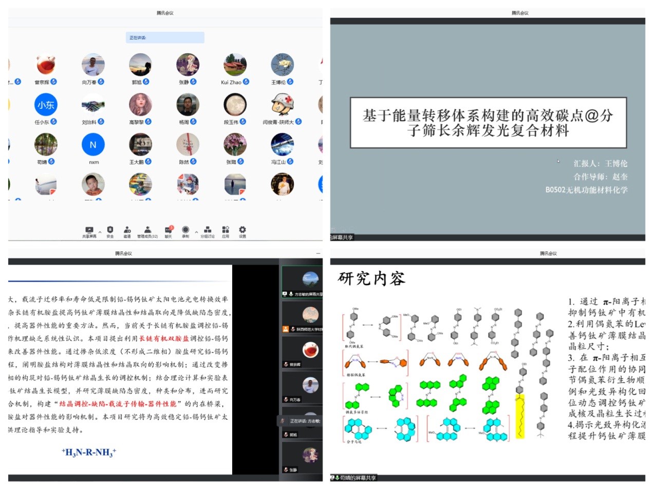 项目汇报按照学科方向分为两个小组,即催化/有机-无机光电组和光电转化组,分别由刘宗怀教授和赵奎教授主持。近20余名拟申报基金的老师从申请书主题、申报门类、立项依据、拟解决的科学问题、研究基础等方面进行汇报。评审专家结合国基金申报和评审经验,针对申请书的立项依据、关键问题、可行性分析、年度计划等方面作了深入剖析和点评,并针对内容过泛、题目过大、申报口不明确等问题逐一给出了针对性的建议。