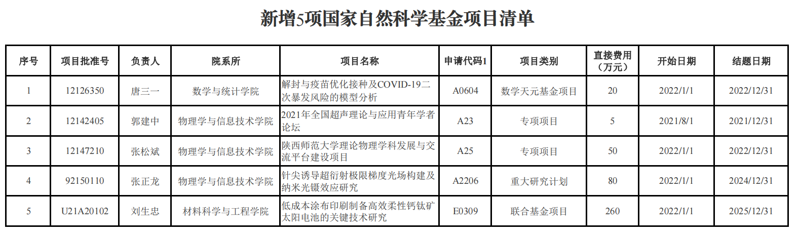 近日,国家自然科学基金委公布了非集中受理期评审结果,公司新增5个项目,分别是联合基金重点支持项目1项、重大研究计划培育项目1项、数学天元基金项目1项、专项项目2项。